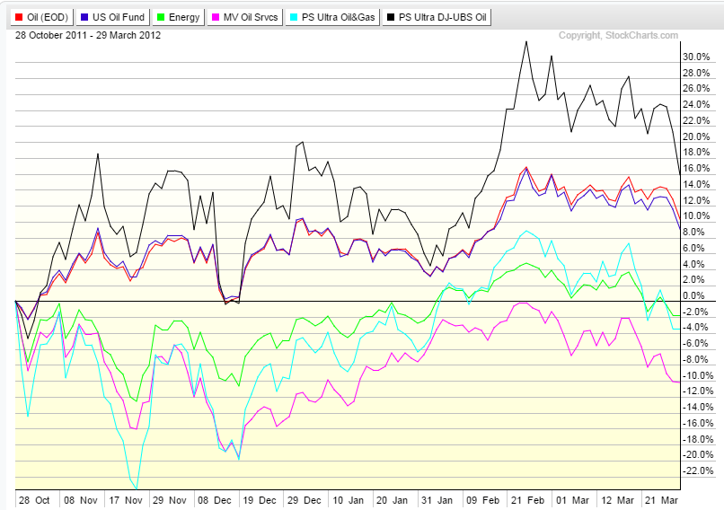 As expected given the performance of OIH and XLE, DIG takes off like a rocket and returns over 30% in 5 months. But even UCO shows a profit of close to 8% despite oil being flat.