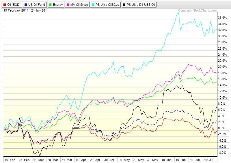 For medium term trades, you probably should look at the leveraged oil ETF like UCO and SCO. They clearly show some great results over multiple months but do suffer from decay as well. As it is, they should not be seen as long term trading instruments. DIG and DUG show potentially good returns, but as proxies for XLE and OIH rather than the oil price itself.
