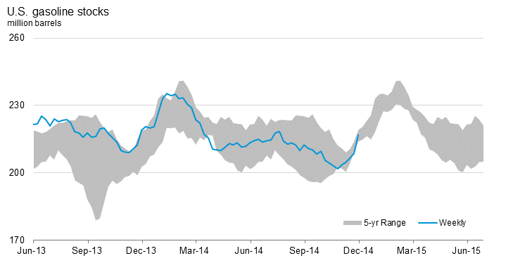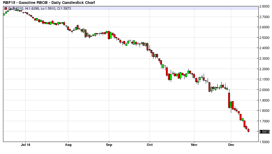 If we look at gasoline stocks the US currently has roughly 216 Million Barrels in storage that compares with 219 Million Barrels in storage a year ago. The RBOB Futures price was $2.73 per gallon a year ago (depending upon the contract), and in the $1.60 range today, so over a dollar re-pricing for gasoline on basically the same level of gasoline supplies, and this is a week after an abnormally large build in weekly inventories which may have pulled forward from next week`s figures. And on July 4th the US had 214 Million Barrels in storage at the heart of the summer driving season compared with just 5 Million more in the weak part of the gasoline demand season. Yet the RBOB Futures price was $2.75 in July versus $1.60 today with what amounts to basically noise in Inventories of actual gasoline products, that`s a sharp $1.15 per gallon difference in price.