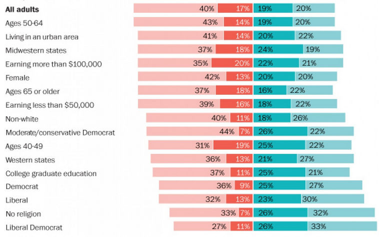In that combined group, only the Democrats, Liberals, No Religion, and Liberal Democrats take a generally opposing stance.