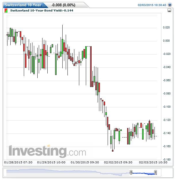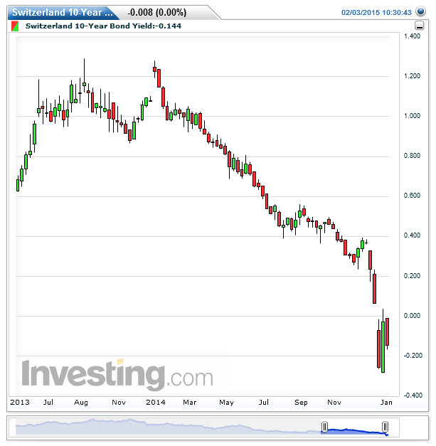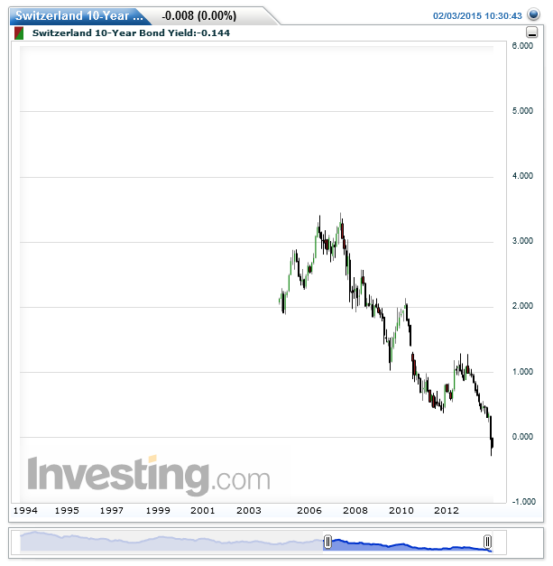 Switzerland`s 10-Year Bond Yield is now negative 15 basis points, yeah that`s right we don`t even have to bring up the notion of inflation and real rates of return, the actual 10 year bond for Switzerland is charging investors 15 basis points for the privilege of buying Swiss debt, and you thought CD rates were bad.