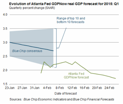 “The GDPNow model forecast for real GDP growth (seasonally adjusted annual rate) in the first quarter of 2015 was 1.7 percent on February 26, down from 1.9 percent on February 18. The first-quarter nowcast for real residential investment growth fell from 11.1 percent to 2.3 percent following Monday’s existing-home sales release from the National Association of Realtors and yesterday morning’s releases on sales and construction costs of single-family homes by the U.S. Census Bureau.”