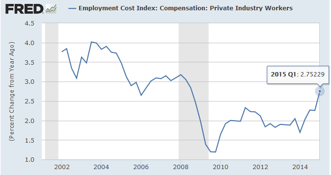 A BLS report out today shows Compensation Costs up 0.7% December 2014-March 2015 and 2.6% over the year ending March.