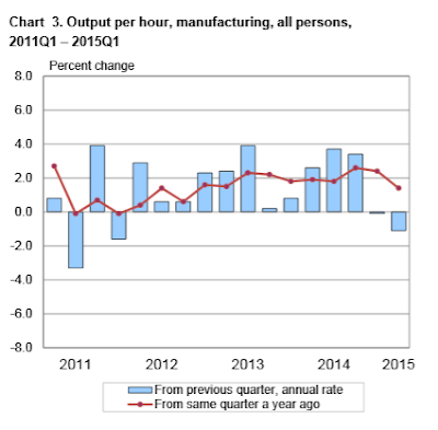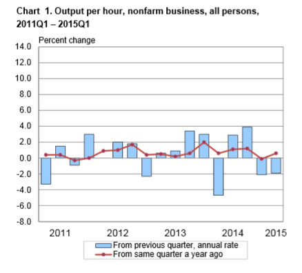 Nonfarm business sector labor productivity decreased at a 1.9 percent annual rate during the first quarter of 2015, the U.S. Bureau of Labor Statistics reported today, as output declined 0.2 percent and hours worked increased 1.7 percent .