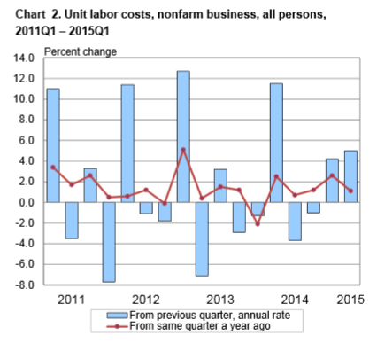 Unit labor costs in the nonfarm business sector increased 5.0 percent in the first quarter of 2015, reflecting a 3.1 percent increase in hourly compensation and a 1.9 percent decline in productivity. Unit labor costs increased 1.1 percent over the last four quarters.