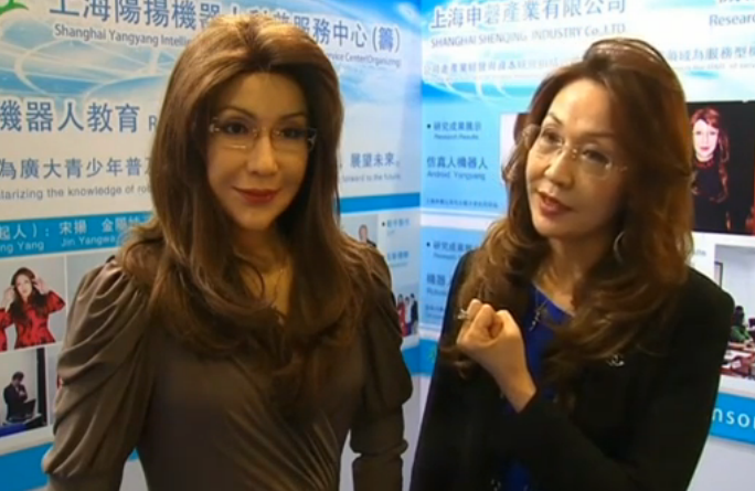 A female humanoid robot “Yangyang“, named and modeled after her creator, has a variety of realistic facial expressions. “Yangyang” wows visitors at Beijing’s Global Mobile Internet Conference.