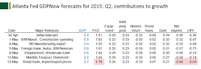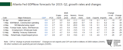 The GDPNow model forecast for real GDP growth (seasonally adjusted annual rate) in the second quarter of 2015 was 0.7 percent on May 13, down slightly from 0.8 percent on May 5. The nowcast for second-quarter real consumer spending growth ticked down 0.1 percentage point to 2.6 percent following this morning’s retail sales report from the U.S. Census Bureau.