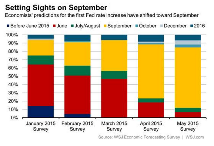 The latest survey was conducted after the April jobs report was released a week ago. It found that nearly three-quarters (73%) expect a rate hike in September. We also think that is the most likely scenario.