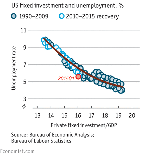 Here is an example. In the chart below the author argues that the current US unemployment rate is abnormally low. Given how weak fixed investment (buildings, equipment, technology, vehicles etc.) has been, the unemployment rate should be higher than it is. Therefore, the argument goes, the low unemployment rate is not fully capturing the weakness in US labor markets.