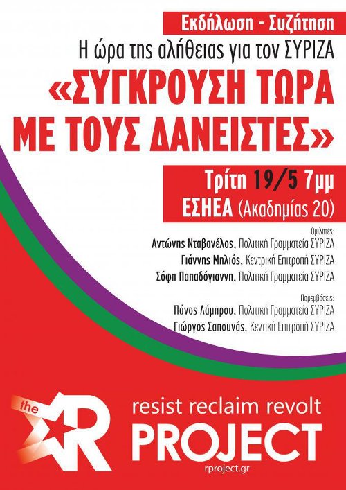 Prominent members of the Central Committee and the Political Secretariat of Syriza are preparing an event for tomorrow, Tuesday May 19. Quoting from the event description, as well as the title of the invitation-pamphlet, the message of the event seems quite clear: “the only way out [of the impasse] is the choice of rupture with the lenders.” :