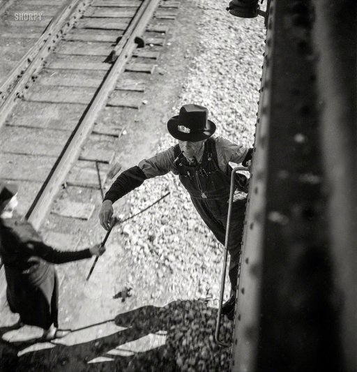 Jack Delano Conductor picks up message from operator on the Atchison, Topeka & Santa Fe 1943