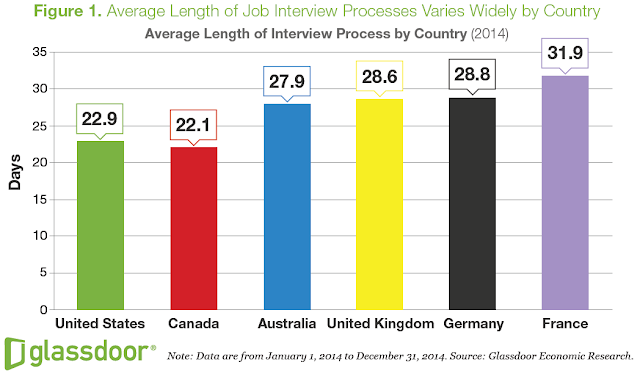 The chart below shows the average time for hiring processes by country in 2014, which ranged from 22.1 days in Canada to 31.9 days in France.