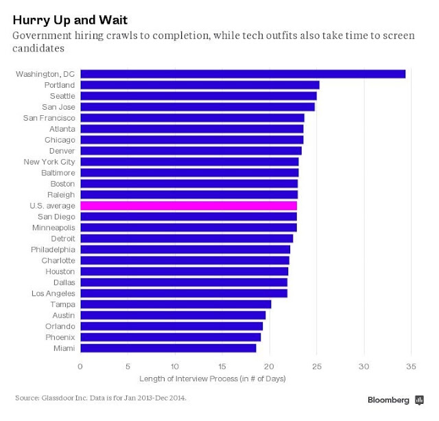 Of course bureaucracy is certainly a factor contributing to the current lengthy hiring process. The chart from Bloomberg (based on the same Glassdoor research data set) shows the number of days in the interview process by major U.S. cities. So not surprisingly Washington DC bureaucrats lead the U.S. city group with the longest waiting days of 34.4 days.