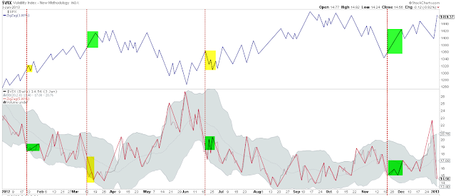 In general, when VIX closed under its lower Bollinger Band, volatility rose by at least a 5-10% in the weeks ahead. But the effect on SPY has been mixed. On its own, this is not a warning to expect a dramatic fall in equities in the weeks ahead.