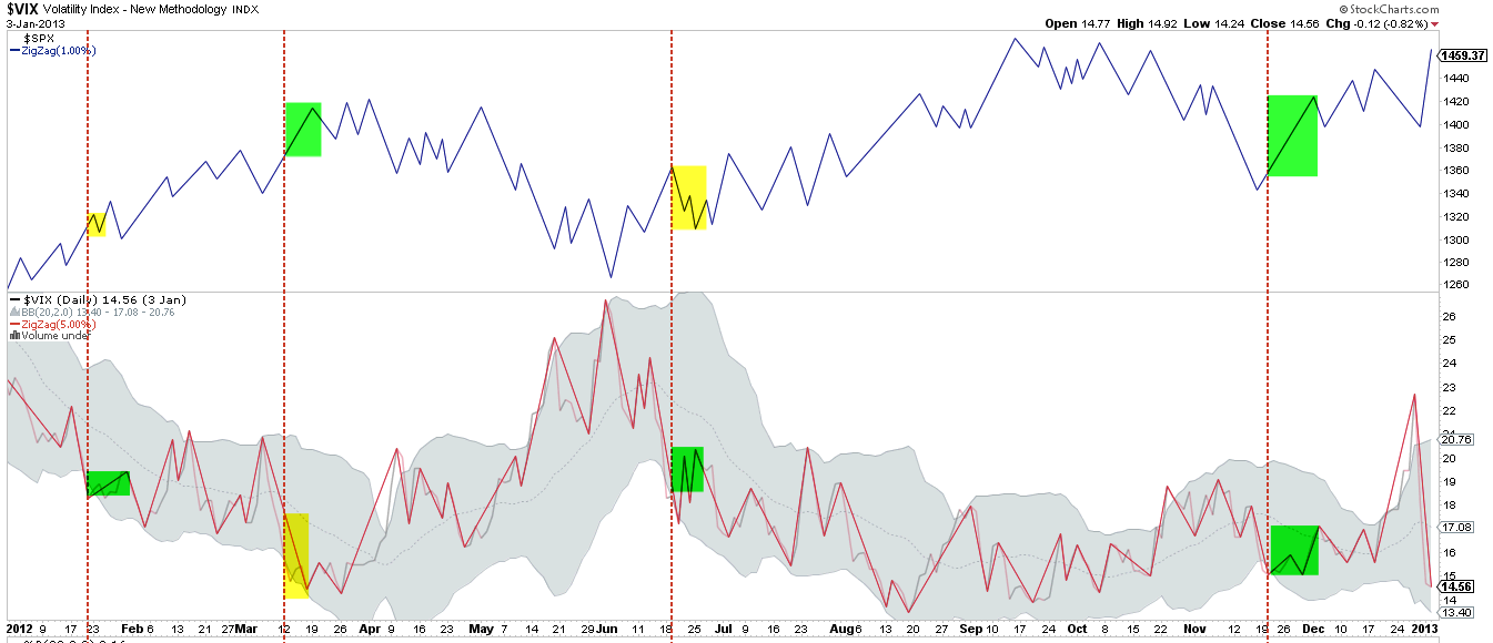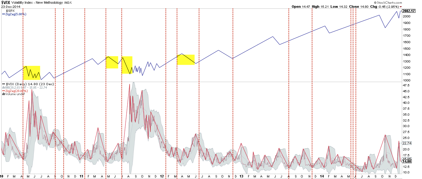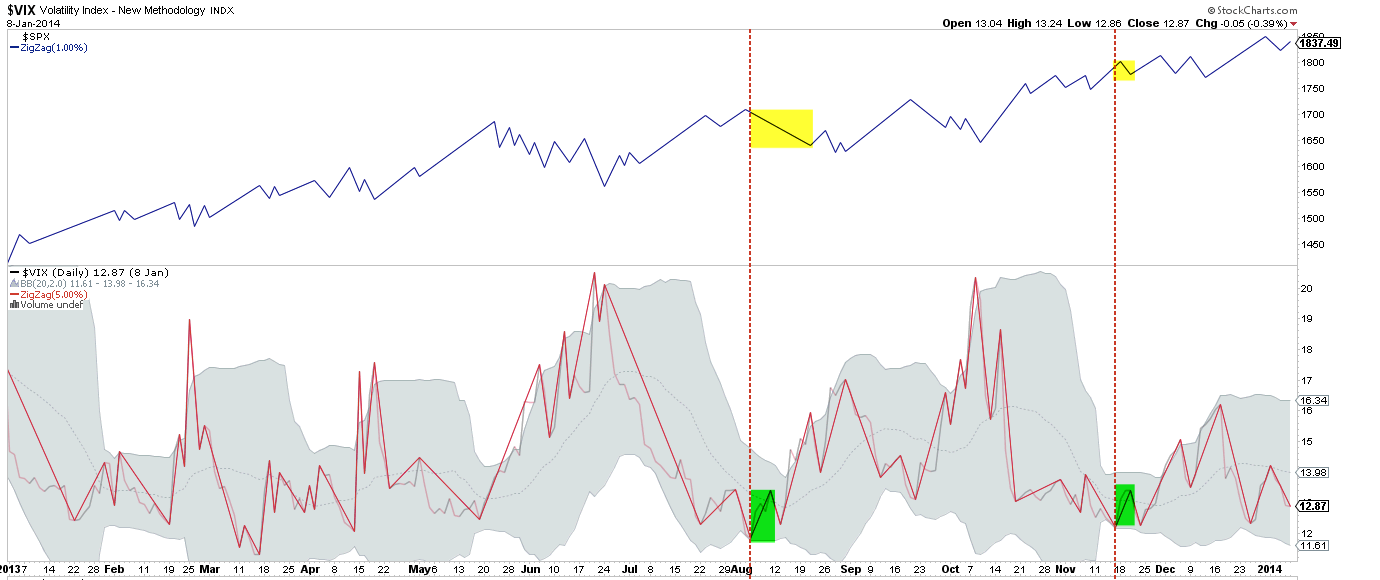 In 2014, there were 3 instances when VIX closed below its lower Bollinger Band. VIX rose every time, once by more than 10% (lower panel). SPY fell by more than 1% twice but rose unabated once. The overall uptrend in SPY was not affected.