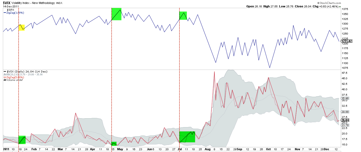 In 2011, there were 3 instances, including 2 were VIX rose more than 10%. Of note is SPY rose in the week ahead twice but both times were significant market tops (May and July).