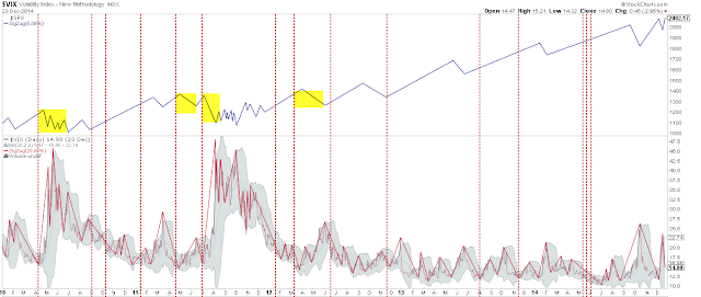In 2013, there were only 2 instances and VIX rose by more than 10% both times. SPY fell both times and struggled in the weeks ahead.