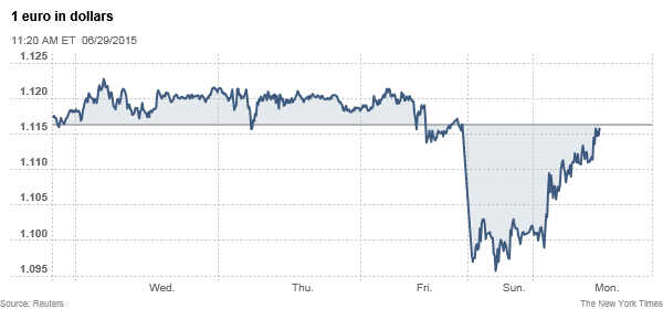 Greece is still staring down the barrel of a $1.8-billion loan payment to the IMF (supposedly due on Tuesday). The latest development is that Greece imposed emergency capital controls and closed banks starting Monday June 29 until after a July 5 referendum on a deal with European creditors. The real cash has already fled as people have moved most capital (that could be moved) out of Greece, which could be partly why things in Greece have so far remained in an orderly fashion.