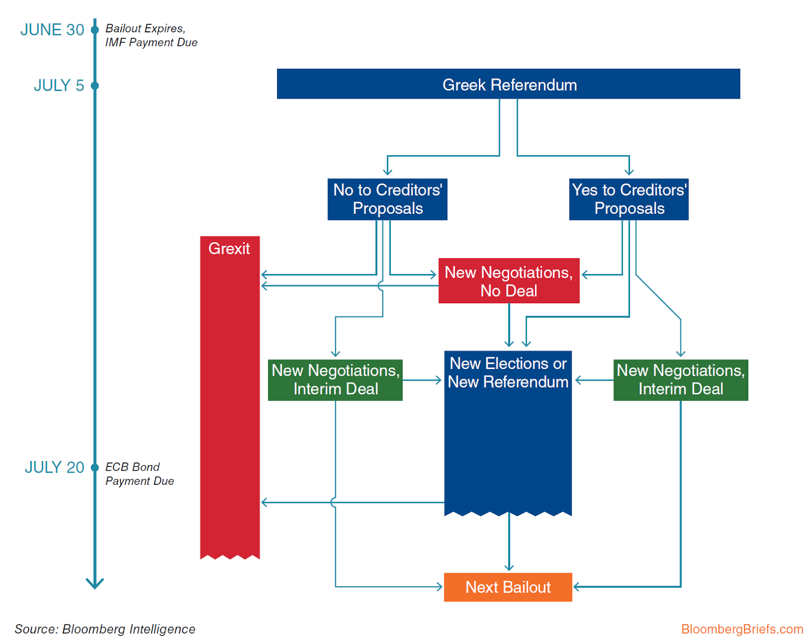 So for all likelihood, the referendum is still to take place on Sunday, July 5. Below is a flowchart by Bloomberg showing possible outcomes of the Greek Referendum.