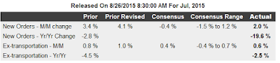 In a special note on year-on-year change, total new orders are down 19.6 percent which reflects an aircraft comparison with the Farnborough airshow in July last year. Excluding transportation, orders are down 2.5 percent which is an improvement vs declines of 4.5 and 2.7 percent in the prior two months.