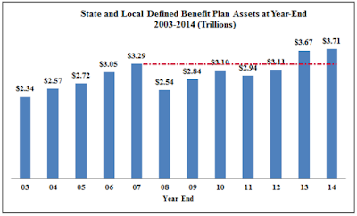 Between the end of 2007 and end of 2014, pension plan assets rose from $3.29 trillion to $3.71 trillion. That’s a total rise of 12.76%.