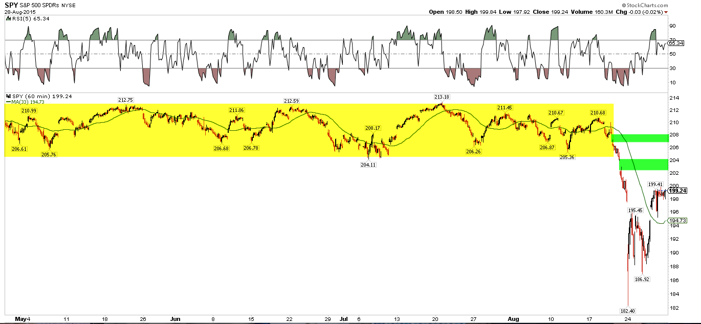 The open gaps in SPY are areas where investors woke up and found themselves trapped from the overnight fall; these are likely to be resistance levels: 202-204 and 206 (green). The area around 204 is likely to be particularly formidable, as this was also the bottom of a long trading range (yellow). A rally to 204 would equal 9% off the low. On the downside, filling the open gap at 194 would equal a 50% retrace of the initial bounce.