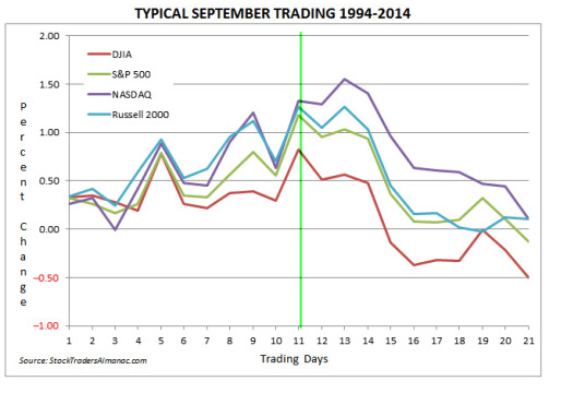 This roughly fits the pattern around Labor Day: SPY is normally strong leading into the holiday (which is next weekend) but turns neutral the week after (data from SentimentTrader).