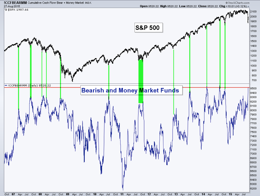 In the chart above, large outflows in 2012 (May), 2013 (June) and 2014 (October) corresponded to durable lows in equities. In August 2007, SPY had dropped more than 10% (similar to now) in the course of a month. The large equity outflow marked the exact low (red arrow) and SPY was 12% higher two months later.