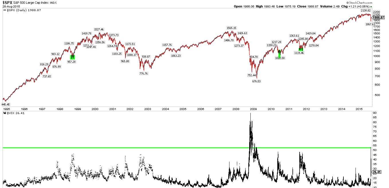 VIX shot up over 50 this week. This is the highest level in 20 years outside of the 2008-09 meltdown. Clearly, fear levels were extreme. The more important point is that in each similar case during a bull market (highlighted) it took at least 2 months and sometimes as long as 6 months before VIX fell back under 20. This suggests that the coming weeks (and longer) will likely remain volatile; again, trading ranges will be wide and loose. A 10% move higher followed by a retest of the lows by the end of October is within that realm.