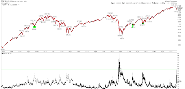 In 1998 (right side of chart above), SPY also hit first resistance at levels where investors had been trapped by the swift fall (horizontal lines). The first low was retested in the next week and next month. In between, SPY rallied 13%. The first low was largely the extent of the downside.
