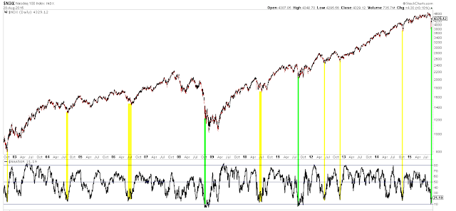 In the Nasdaq, breadth has only twice in the past 15 years been more washed out than it was this week: near the end of the 2008 decline and at the 2011 low (green lines). Lows in the NDX have typically come when breath was less washed out than now (yellow). This week was an extreme sell off that typically sets up a new leg up in equities.