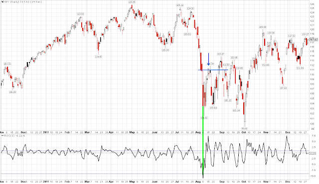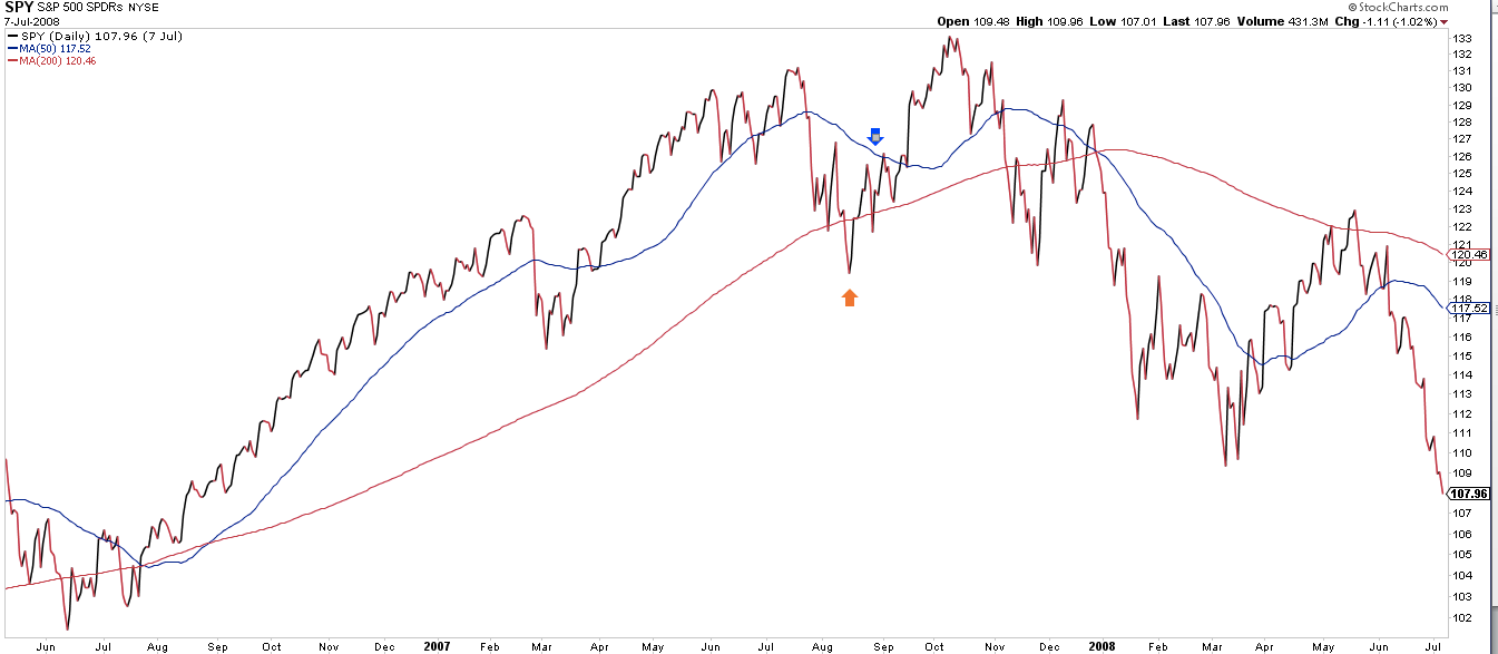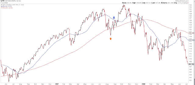Note that at the August 2007 low, like now, SPY was under its 200-dma and it's 50-dma was declining. This was bearish price action; it looked to all like the bull market was over. In the event, it was not a smooth ride higher. More than half the initial bounce off the low was given back in September and it took 4 weeks for SPY to clear its 50-dma (blue arrow). But SPY went on to a new high nonetheless.