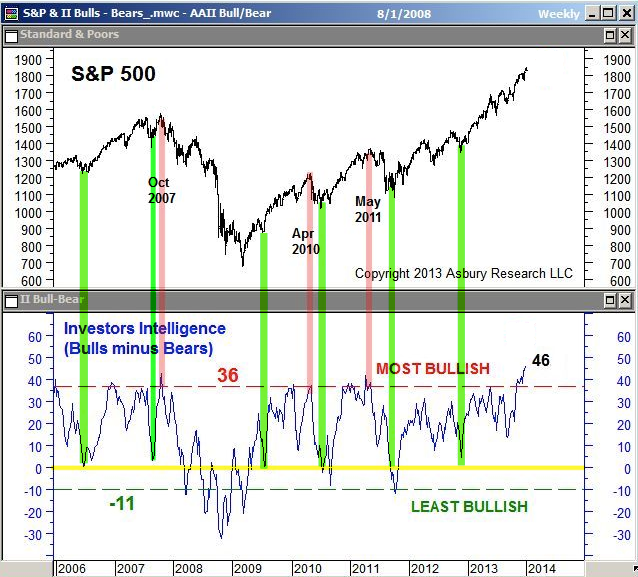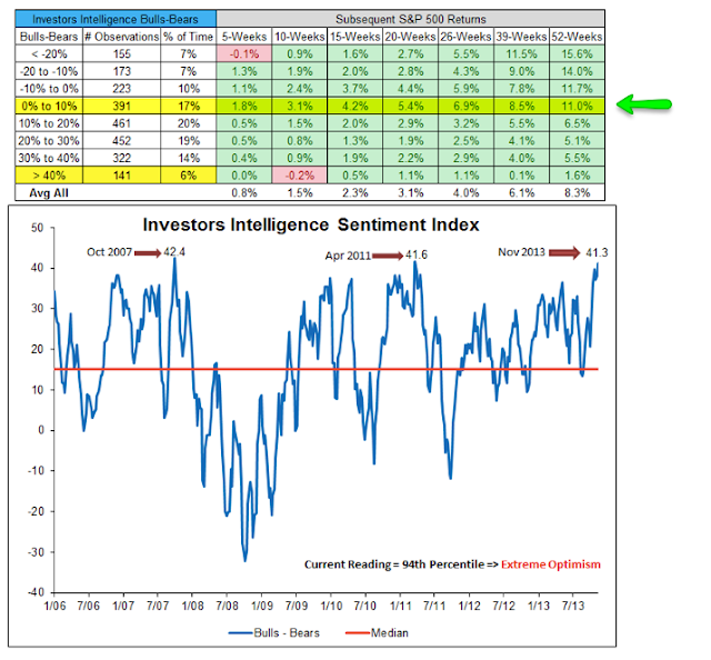 An important point: sentiment turned quickly bullish after the August 2007 low. By October, sentiment had already become overly bullish again. The index peaked and fell into a bear market. This is in contrast to the period after the 2011 low. This is something to watch closely in the weeks ahead.