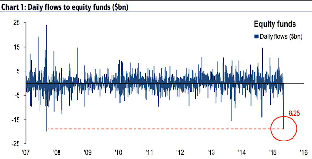 The most compelling evidence that a near low has been established is extreme equity outflows. Almost $30b left global equity funds over the past week, the largest outflow since BAML began tracking in 2002. $19b left equity funds on Tuesday alone, the largest single-day outflow since August 2007 (article).