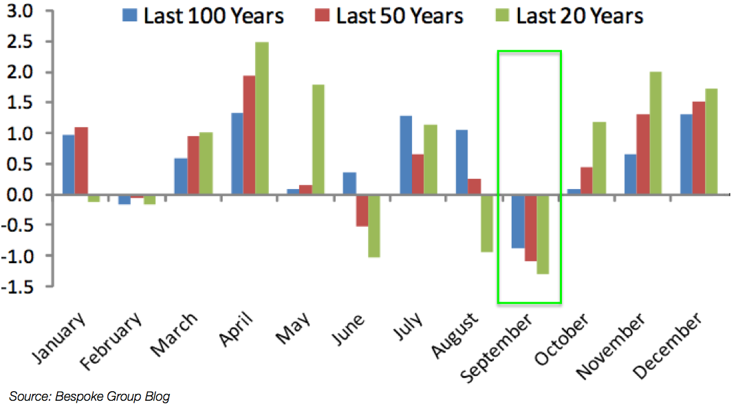 September begins on Tuesday. Over many different time periods, September has usually been a poor month for equities. This would fit with a pattern where equities now work off the extremes in downward momentum over the next month (data from Bespoke).