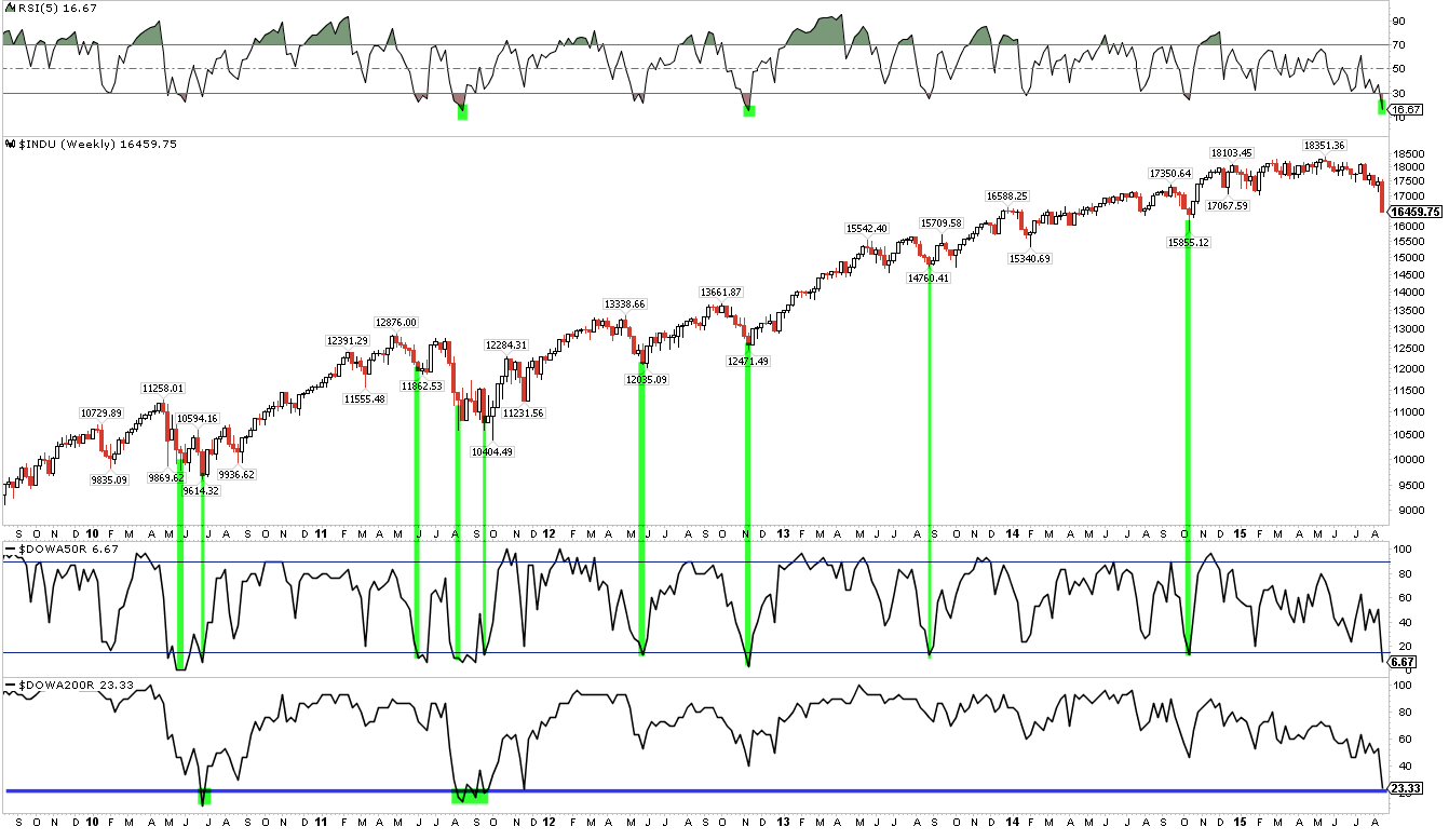 Breadth is as washed out as sentiment. On Monday, the percent of DJIA stocks above their 50 or 200-dma was as low as on July 2, 2010 and August 10, 2011. That was the exact low in 2010 and a 2 month low in 2011.