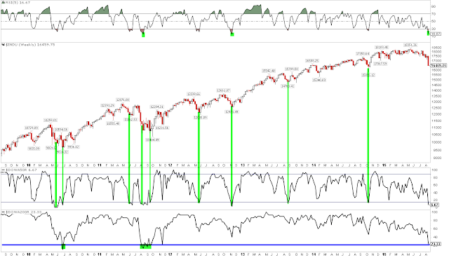 Many sentiment reports look similar to fund flows. Investors Intelligence bulls minus bears fell to 9.1% and NAAIM equity exposure fell to 28%. The chart below is from II; sentiment is at the equivalent level to June and November 2012 and also the August 2007 low referenced earlier (green lines). Perhaps it will sink further to below zero. Based on this, the low this week 'should' be close to a durable low, although one that may be retested.