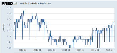 As of yesterday, the effective federal funds rate was a mere 8 basis points. Since April, it has been swinging from a low of 6-8 basis points to a high of 14-15 basis points.