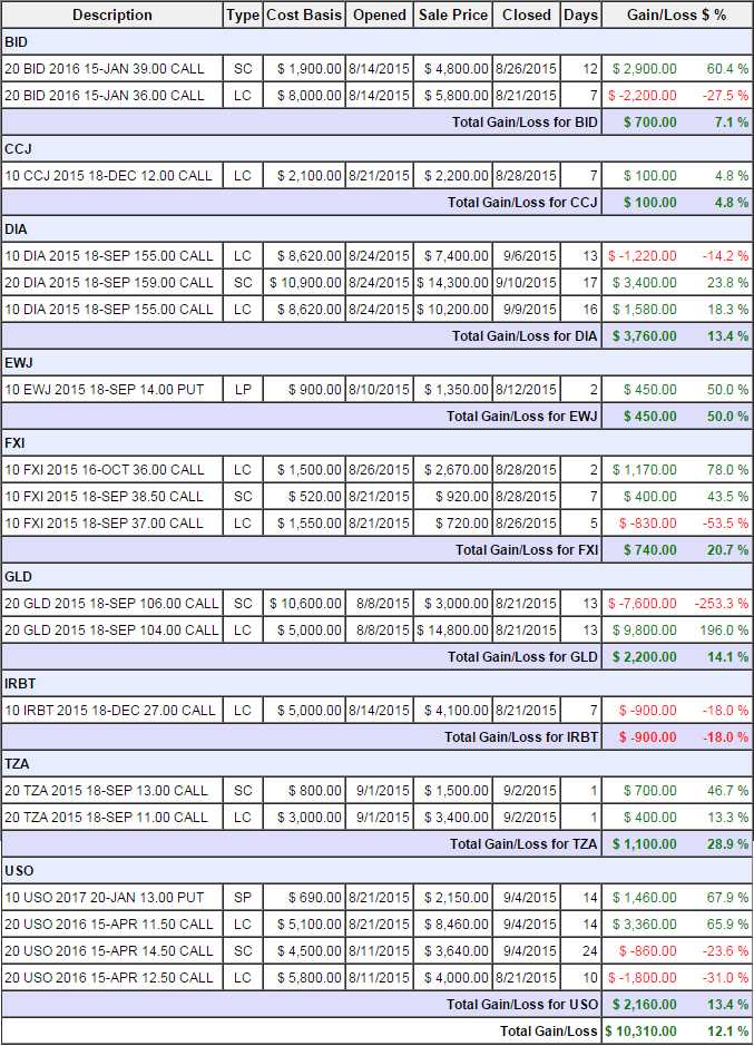 Chaos + uncertainty = CASH!!!  That's the simple formula we like to follow at PSW.  And that's not to say we can't find things to do with our cash.  We started our Option Opportunities Portfolio on August 8th and now, at the end of week 5, we've already closed 9 positions for a $10,310 gain – which is the EXACT plan we laid out when we began this portfolio a month ago: