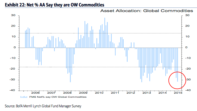 Allocations to commodities fell to -32% underweight from -11% underweight in June. This is 1.9 standard deviations below the long term mean and a 28 month low. The low allocation to commodities goes together with pessimism towards emerging markets and also explains why cash balances are high.