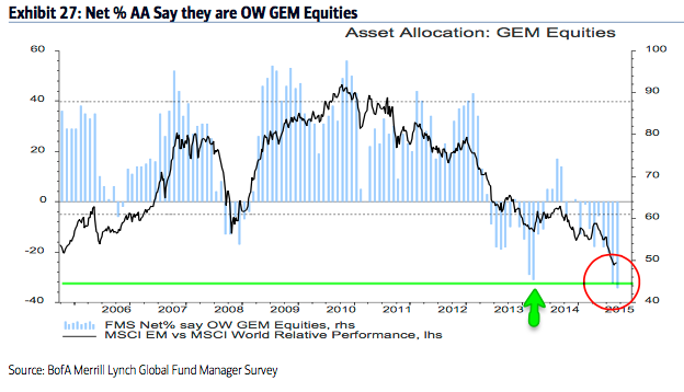 EEM (-34%): Managers dropped their EEM exposure to -34% underweight. This is the lowest in the survey's history.
