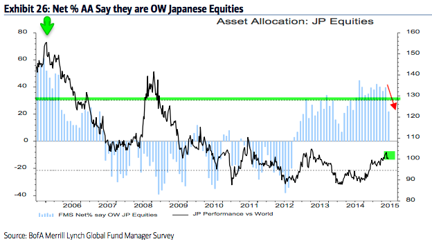 Japan (+22%): Managers are +22% overweight Japan, a big drop from +40% in August. Funds were -20% underweight in December 2012 when the Japanese rally began.
