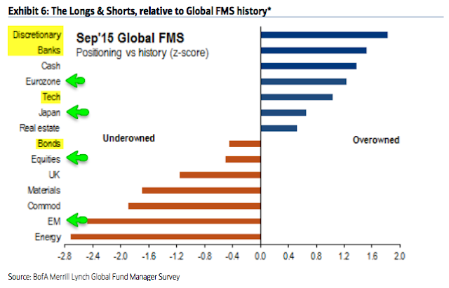 Bonds (-50%): A net -50% are now underweight bonds, a rise from -60% in July and August. For comparison, they were -38% underweight in May 2013 before the large fall in bond prices.