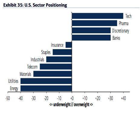 While managers have reduced their equity exposure, they remain overweight the highest beta equities (technology, discretionary, banks). The largest underweights are in commodities (including energy and materials). Fund managers are still -9% underweight defensive staples.