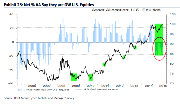 To this end, fund managers became very bullish in July, September, November and December 2014, and stocks have subsequently sold off each time. Contrariwise, there were some relative bearish extremes reached in August and October 2014 to set up new rallies. We did a recap of this pattern in December (post).
