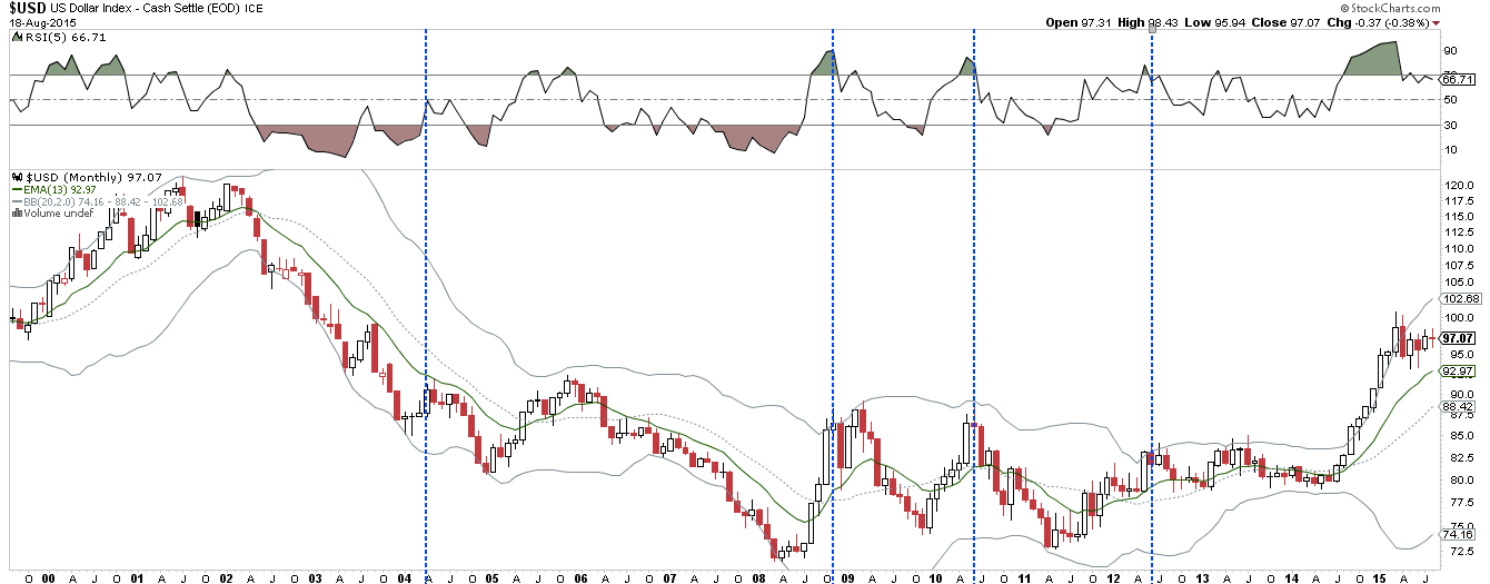 Those periods where the dollar was considered overvalued are shown below (lines).