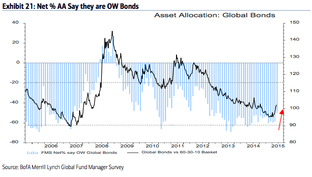 Among the various ways of measuring investor sentiment, the BAML survey of global fund managers is one of the better as the results reflect how managers are allocated in various asset classes. These managers oversee a combined $600b in assets.
