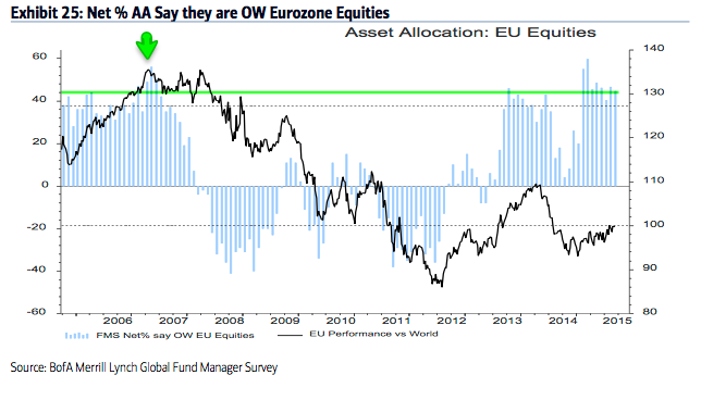 Eurozone exposure was +60% overweight in March, the highest in the survey's history. It is still high, at +45% overweight. This is 1.2 standard deviations above the long term mean. Judging from 2006, European equities are at risk of underperforming.