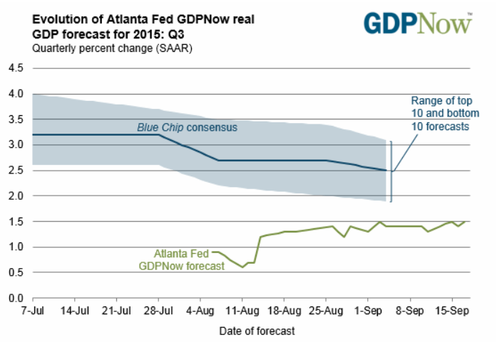 The GDPNow model forecast for real GDP growth (seasonally adjusted annual rate) in the third quarter of 2015 is 1.4 percent on September 24, down slightly from 1.5 percent on September 17. The decline occurred on Monday when the model's forecast for third-quarter real residential investment growth fell in response to the existing home sales release from the National Association of Realtors.