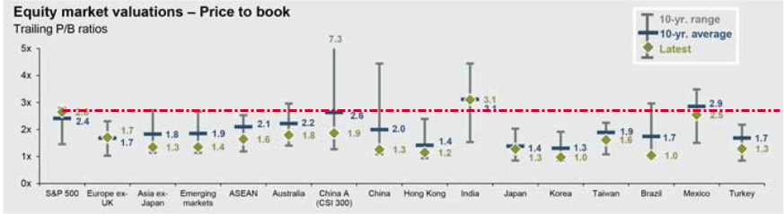 On a price-to-book basis, US equities are twice as expensive as numerous other markets.